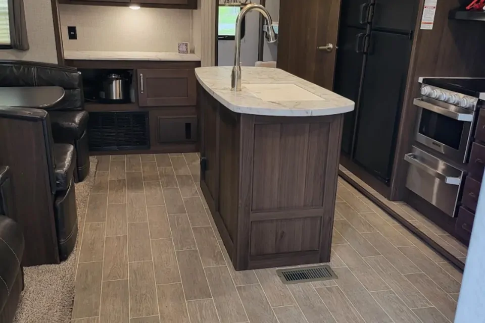 *Inside, you'll find a dining table, a fully functional kitchen sink, a microwave, an oven, a range stove, and a refrigerator. It also includes an inside shower, toilet, and hot and cold water supply for your convenience.