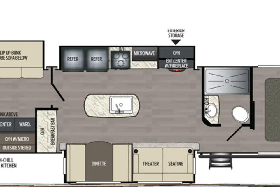 *Outside, enjoy an awning for shaded relaxation and an outdoor kitchen and shower. It also features a TV, radio, and solar power for off-grid living. The extra storage ensures you have room for all your gear.