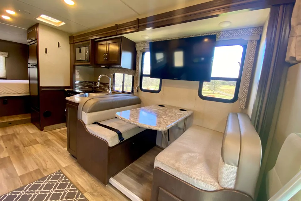 Our Thor Class C is a camper's dream with two slides creating a beautiful and peaceful space for you and your family. It comes with an outdoor refrigerator, an outside TV, and is stocked and equipped with everything you need for your next amazing family adventure! This has been a smoke free RV for its whole life. No smoking is allowed please and thank you.