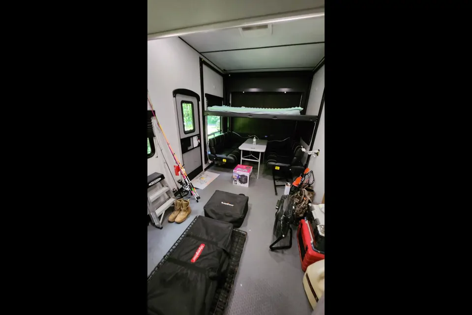 15' Garage with double bunk beds and its own bathroom.