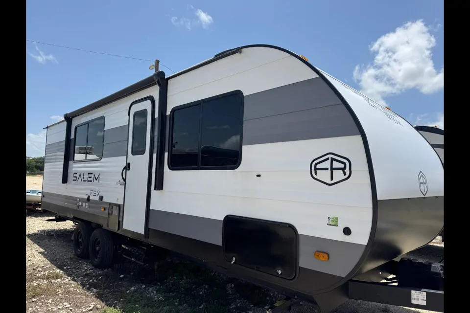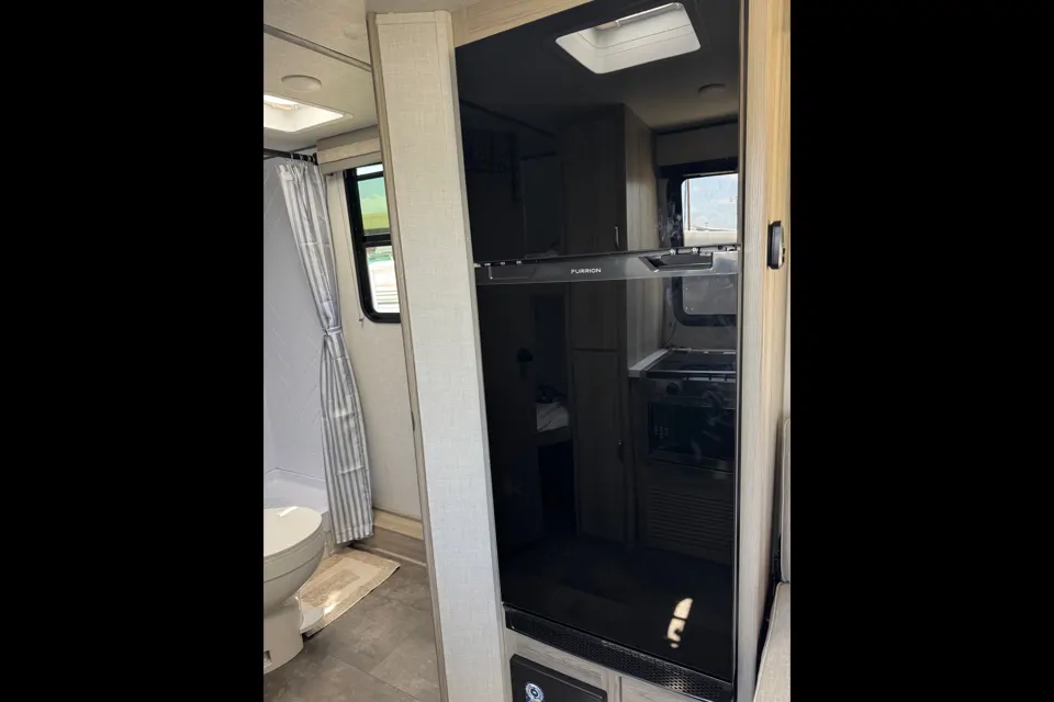 Cozy yet spacious, this RV is the perfect size for families with young children. Each bunk sleeps 2 and has a private screened in window and curtain. There is a USB port in the top bunk. The empty storage space under the bottom bunk is perfect for whatever you need to bring with you on your travels! The couch folds out into a double size bed while still allowing storage underneath. (We store the folding table underneath here when it's not in use.) The bedroom has a sliding door with a magnet closure, plenty of storage space on either side of the bed as well as under the foot of the bed, and two screened windows. USB and standard outlets are on either side of the bed. The bed board can be lifted for easy access to the storage compartment (which can also be accessed from either exterior side of the trailer.)