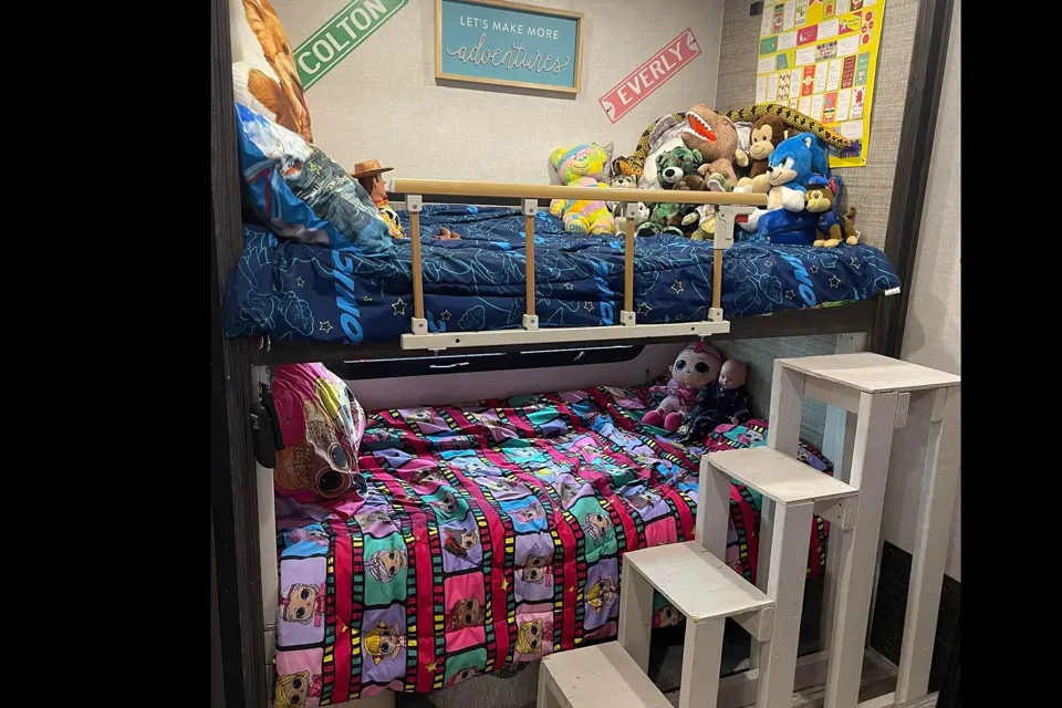 Family friendly fifth wheel perfect for a little family to enjoy vacation. Bunk room for kids and master room with queen mattress perfect tor family vacation. Full kitchen with full size fridge. Oven, stove, microwave, even an ice machine ! Living room has couch that can fold out to bed and even two recliners that have heated seats! Enjoy this camper with your family! Does not include a generator.