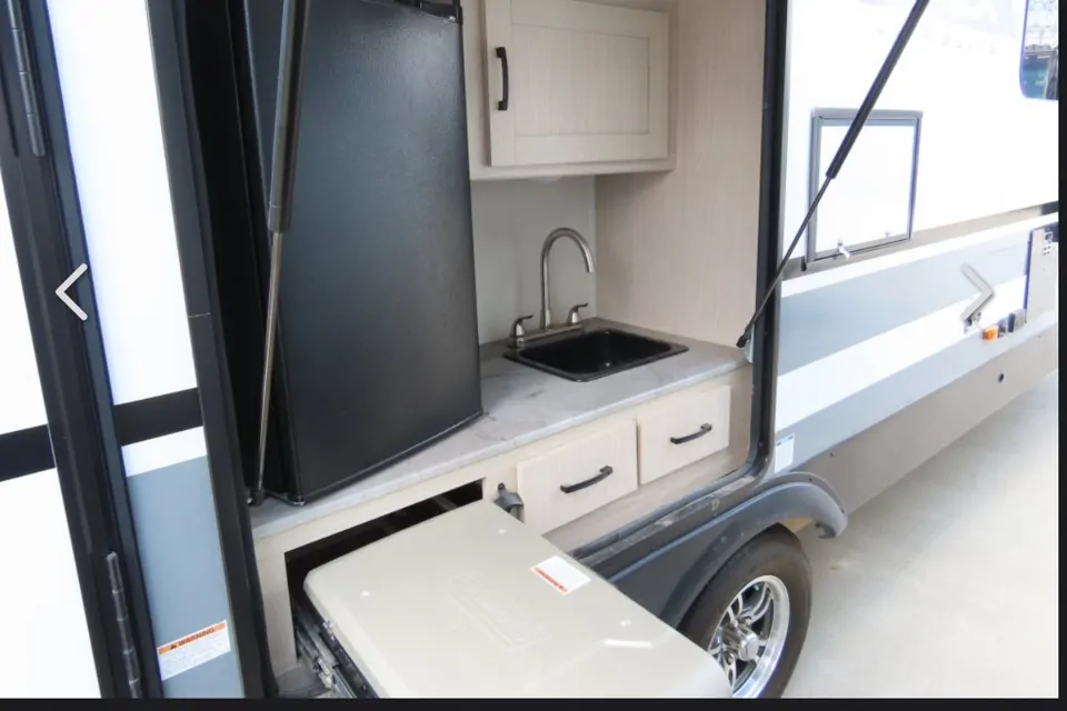 TV, electric fireplace, outdoor grill/kitchen. RV has electric awning. Comes with jack levels and Septic hose. 50amp power connection required for power. Heater and AC along with toilet and shower.