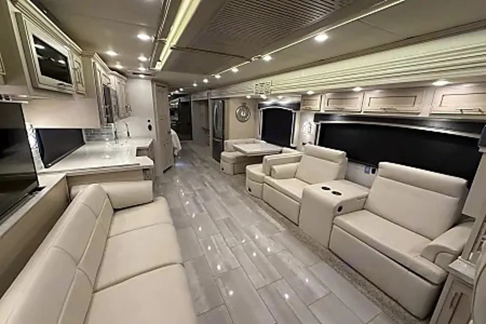 Experience the ultimate road trip in this 40-ft luxury Class A motorhome! The Newmar Ventana 4037 features a VERY spacious and luxurious interior. The Bedroom comes with a king-sized master suite sleeping on a adjustable Sleep Number bed as well as and a luxurious bathroom with a large shower! The main living space comes with a fully equipped gourmet kitchen, multiple TV's as well as large sofas to relax on in the expansive living room after a long travel day or a fun day out on an adventure! Going long distance up and down steep grades? This coach is powered by a Diesel Cummins engine, Stops using Semi sized air brakes, Rides on air ride suspension, and gets better fuel economy than its gas counterparts doing the same thing. When they say it drives like a dream, they mean it. Go drive any other unit, then come talk to us if you don't believe us. With an automatic leveling system, power awning, and heated floors, the Ventana 4037 ensures comfort and convenience wherever you go. Book your next adventure in this luxury home on wheels today!