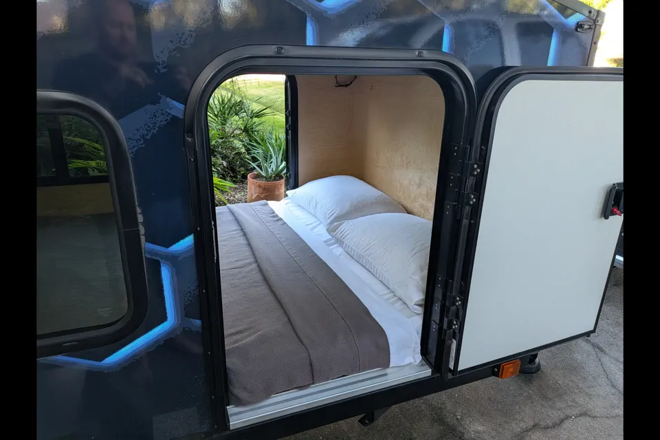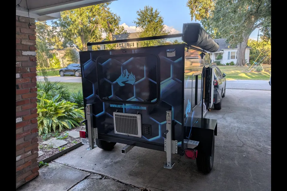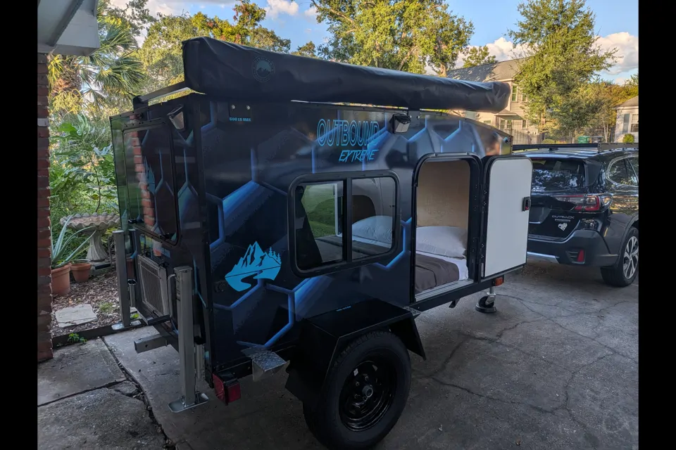 The Outback trailer is a 11ft trailer that sleeps two with AC unit. The compact trailer weighs in at ~2000 lbs and can be pulled by most vehicles. There is storage in the back for kitchen supplies and camping gear. The trailer has a 270 degree awning for shade and rain cover.