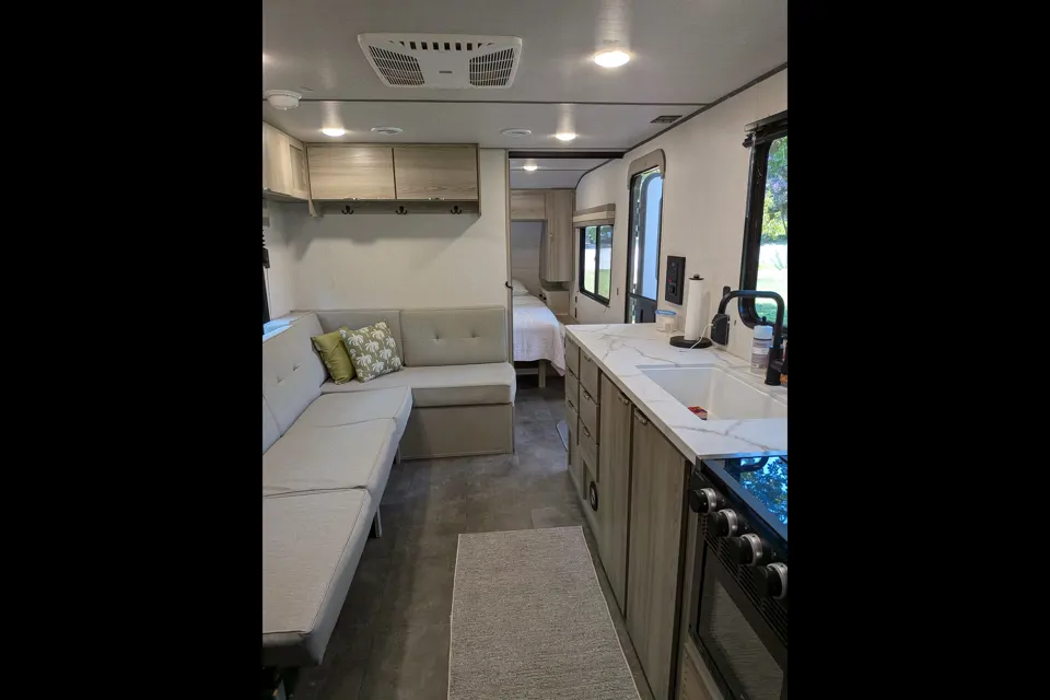 In the main living area, we have a sectional sofa that converts to a double bed. A folding dining table is stored below. Our well-stocked kitchen features a large window, TV/dvd, residential size sink, extra counter space, oversized refrigerator and freezer, 3 burner stove, microwave/convection oven, Keurig coffee maker with complimentary coffee, lots of drawer space and a pantry cabinet.
