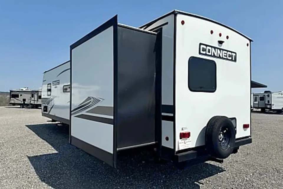 Connect is modern and sleek with an affordable price tag! It comes standard with a king-size bed, residential-size kitchen, and entertainment center. The bunk room which includes two single upper bunks and a small dinette which can be converted into a bunk plus the kiddos will have their own toilet and sink for it has a half bath. In the living room you will find that there is an electric fireplace and an upgraded dual reclining sofas. Outside you will find a full-fledge outdoor kitchen with mini fridge.
