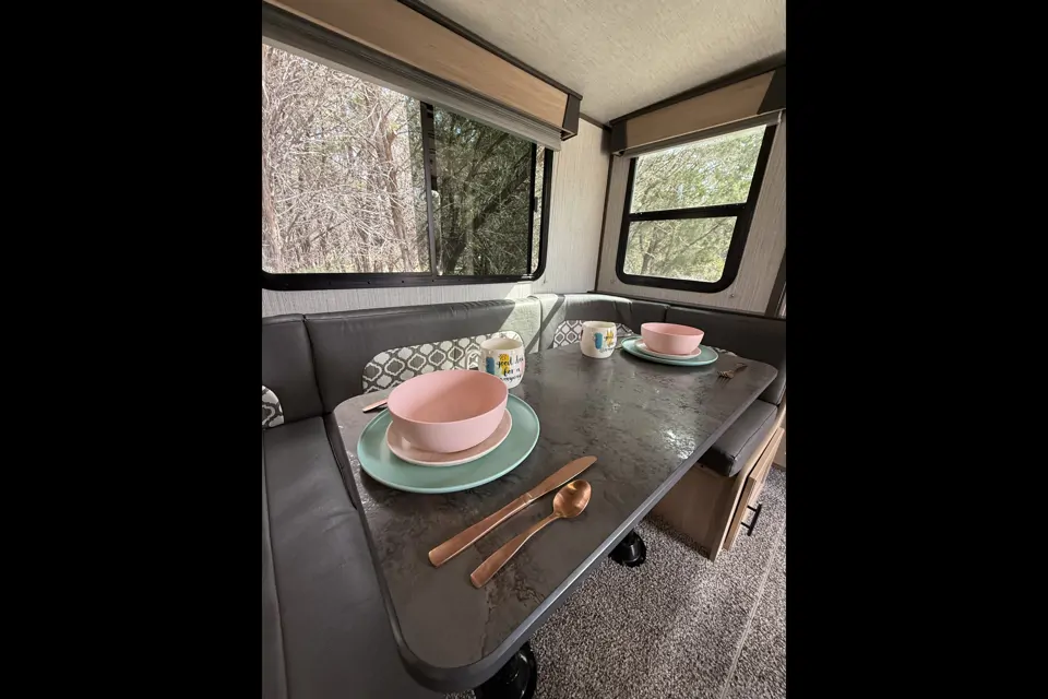The camper is fully stocked so you can arrive and relax right away. The kitchen includes cookware, dishes, utensils, coffee supplies, and everything needed to prepare meals. Enjoy indoor cooking with the stove and oven, or use the outdoor kitchen for that classic camping experience.