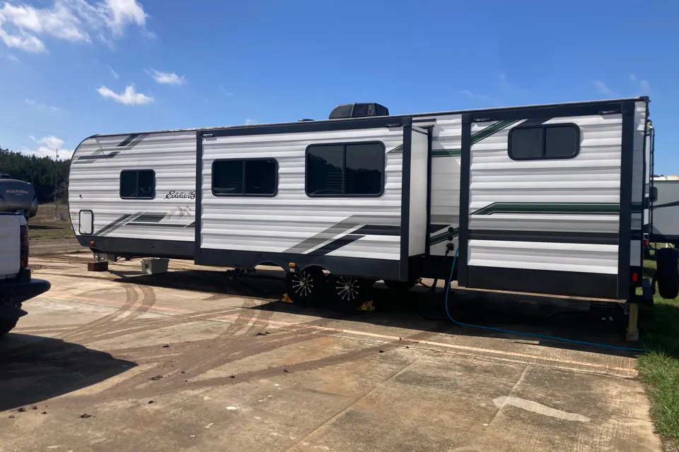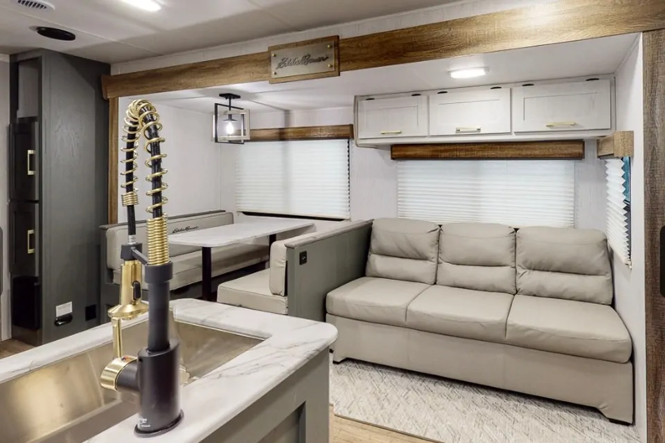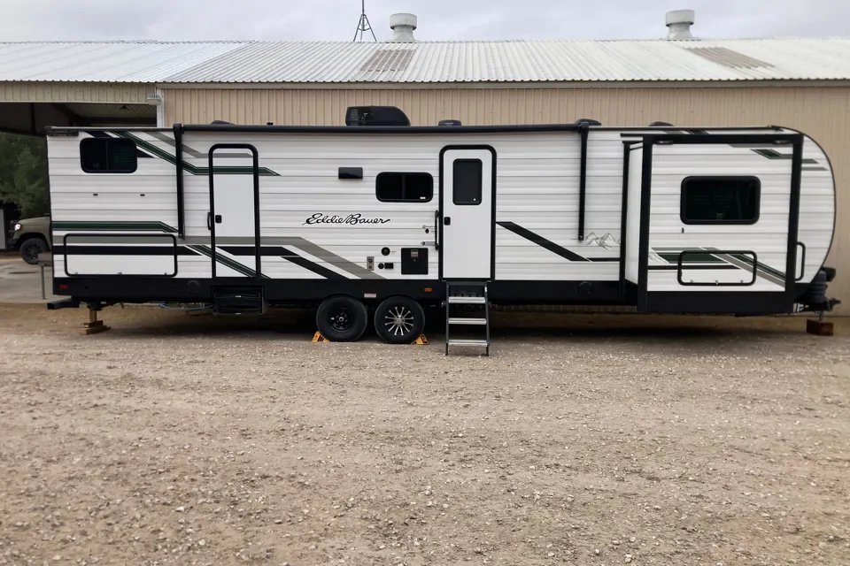 Who among us does not like to have a bit of campground cool with them? If you love to stand out just a bit, check out the Heartland Eddie Bauer 34BHS. Ready for some serious fun in the campground, the Eddie Bauer 34BHS is an amazing bunkhouse floorplan specifically designed for you and your camp-loving family to travel the country in comfort. You’ll find the Heartland Eddie Bauer 34BHS has the colors, graphics and overall feel of what makes Eddie Bauer so endearing in the great outdoors. The RV life is all about being outdoors, not about roughing it. That’s why the Heartland Eddie Bauer 34BHS comes with super comfy designer furniture to sink into at the end your busy camp day with an ‘aah.’