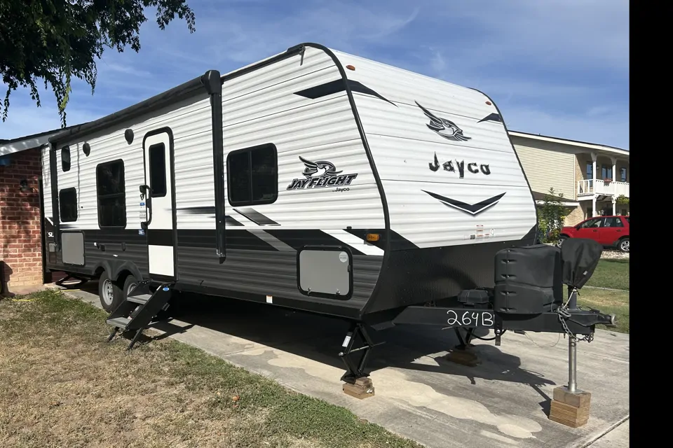 Our 2022 Jayco camper offers sleeping for 6 (8 if 2 are smaller), full bath, kitchen and the AC works great! Sheets, towels, cookware and utensils included. Will deliver up to 100 miles from my location for $3.00 per mile, set up fee $100. Includes outdoor rug and 2 lawn chairs under awning.