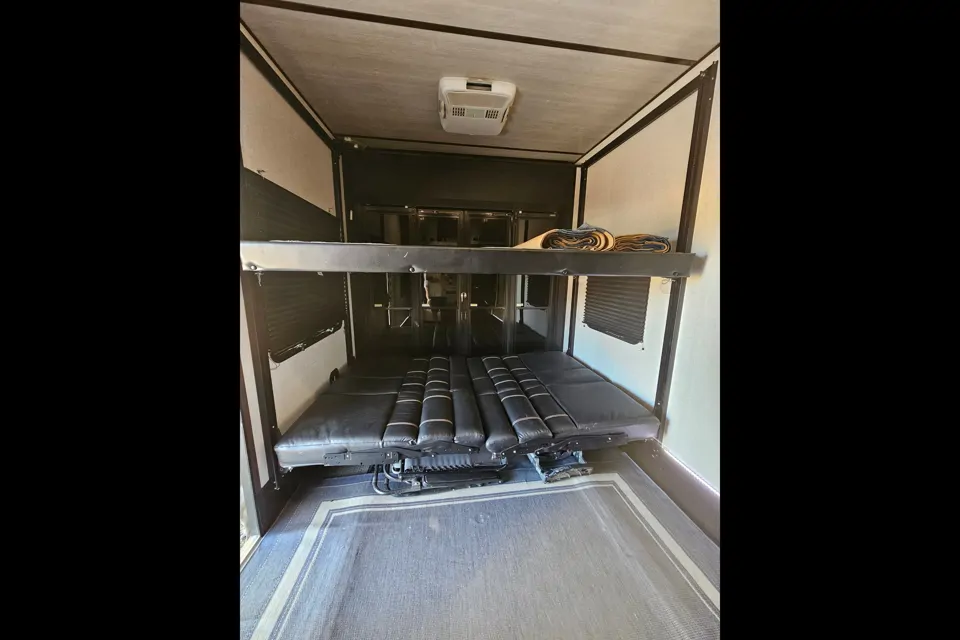 45ft Voltage Toy Hauler with plenty of room for friends and family to stay with you while enjoying the great outdoors. Sleeps up to 7 people and includes a King size bed in the master with two queen beds in the garage for your guest. Also has a twin size loft style bed for the little guys. A half bath is available in the garage so the master can stay available at all times for the primary guest. Residential size fridge and freezer keeps your groceries cold while you're enjoying the outdoor surroundings. The living room has an electric fireplace ready to warm you up during the colder camping months and when the weather is right you can enjoy an outdoor entertainment area including a TV and speakers.