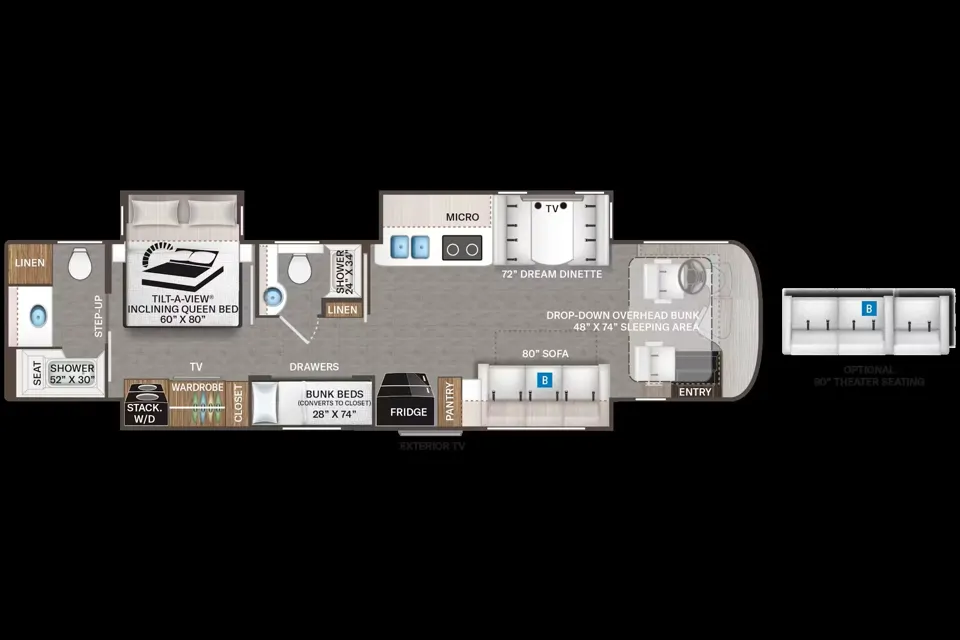 This luxurious coach can fit your whole crew thanks to the added bunk beds within the full-wall slide! There is also a drop-down overhead bunk, a Tilt-A-View inclining queen bed and a 72" Dream Dinette for even more sleeping space! A full rear bath on board will let you clean up each morning, and there is a second full bath across from the bunks for your guests; how convenient! Head to the kitchen to prepare breakfast on the two burner electric induction cooktop or in the stainless steel over-the-range convection microwave, and there is a 19 cu. ft. side-by-side residential refrigerator where the milk and eggs can go back in. After a day outdoors relaxing under the 20' power awning and watching the game on the exterior 40" LED TV, you can head indoors to play a game at the Dream Dinette or get cozy with a book on one of the three fully reclining comfy seats.