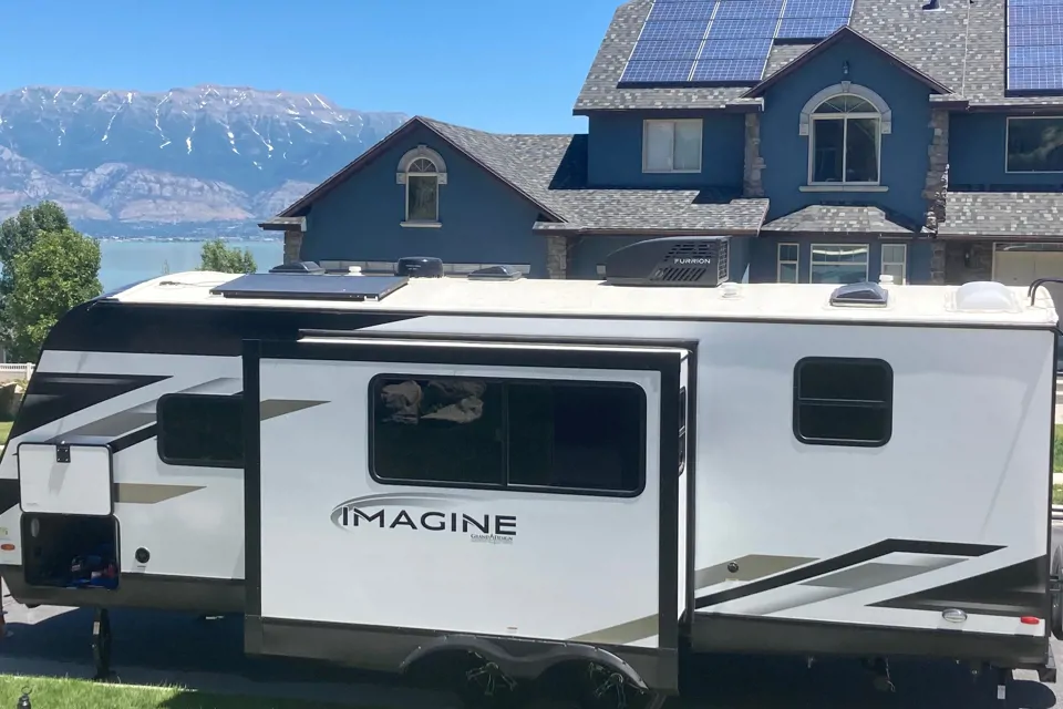 This is packed with high-end components. 165W Solar panel (can run fridge while driving down the road) & allows you to escape anywhere you can "Imagine". HD TV W/swing arm, all-in-one utility station, tankless water heater, power tongue jack, outside grill & mini fridge, lighted awning, hot/cold water hook-up outside, abv industry standard insulation, AC, attic vent, heated & enclosed underbelly w/suspended tanks/heated & enclosed dump valves, Evenflow heating system (making this usable all year round). Unobstructed pass-thru storage/plenty of all around storage.