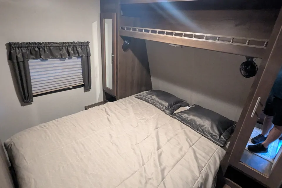 The private master bedroom includes a comfortable queen bed with under-bed storage and dual wardrobes. In the back, the bunkhouse offers a great space for kids or extra guests, with double-sized bunks and plenty of storage. The Wildcat’s bathroom comes complete with a full-size shower and an exterior entrance for added convenience while enjoying the outdoors.