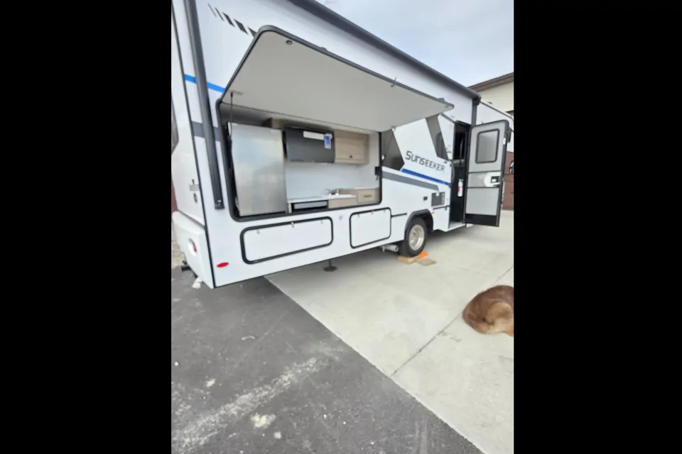 With 2 slide outs the spaciousness is unmatched. This unit sleeps 6 adults (or 4 adults and 4 kids) comfortably. The Sunseeker is fully equipped with all the amenities including Dishes, Utensils, Cookware, Linens, Towels, and Toiletries. The outdoors of the Sunseeker has a convenient kitchen featuring a cook top, sink, fridge, and the cutest little outdoor charcoal grill, EVER. There is an out door rug, chairs, trash can, table and other amenities to enhance outdoor living while on your trip. The storage is more than generous both inside and outside.