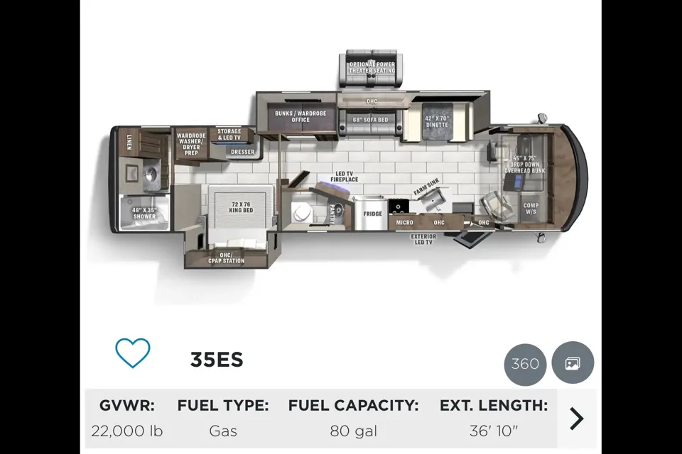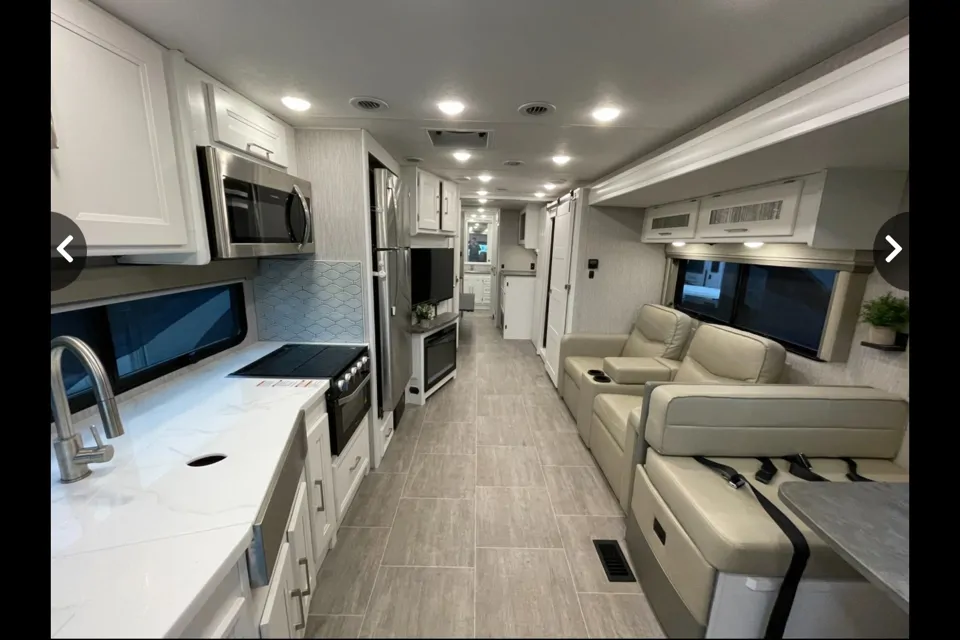 No matter the occasion: vacation getaway, glamping, or try-before-you-buy; this is the coach for you! Beautiful 2022 coach with extra amenities including a tv on the outside of the rv, as well as 2 more inside. There’s lots of sleeping room including a “secret” electric bed. It also features a king size bed, bunk beds, a half bath, full sized bathroom with large shower, spacious kitchen and a washer/dryer. The cozy, led fireplace provides year round ambiance with optional heat on or off. After spending time in this home away from home, you may not want to even return home!