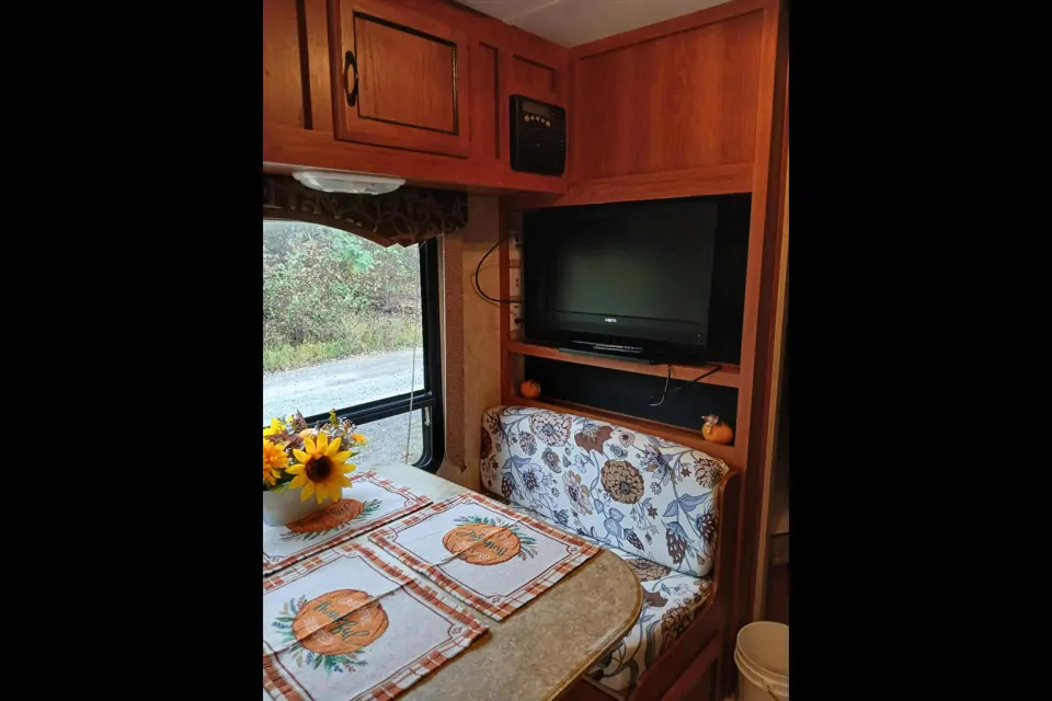 Home Away From Home is a cozy camper that you will feel right at home staying in. It's 17 ft. but when beds are opened its 21ft. All dishes, pots, silverware, coffee pot, tea brewer, it's fully stocked for you. Linens are also included. All you have to bring is your food and clothes. Tv and DVR included. Sleeps 5 comfortably. Queen bed, full bed, and table makes a twin bed. This camper is available year round as long as no snow on the ground. Any question please feel free to ask.