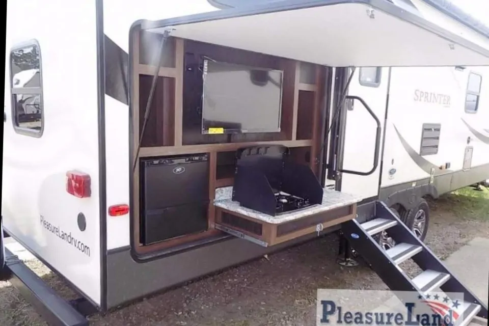 Sleeps 8 a pull be hind and outside fridge tv and stove awning a air and fridge inside pull out sofa in closed bedroom inside tv radio smart tv and more have table pulls down to a bed plenty of space two slide outthis is a perfect camper for a family camping trip it's a home away from home.