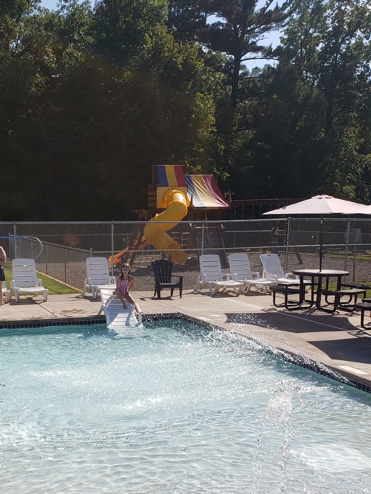 The campground accommodates both RVs and tent campers with comprehensive infrastructure including full hookups (30 and 50-amp electrical), pull-through sites, shower facilities, dump station, and propane service. Recreation options are extensive, featuring two playgrounds, heated swimming pool and hot tub, game room, fishing pond, and organized activities including volleyball, horseshoes, basketball, BMX track, and gaga ball. Families benefit from swimming lessons offered during the operational season.
