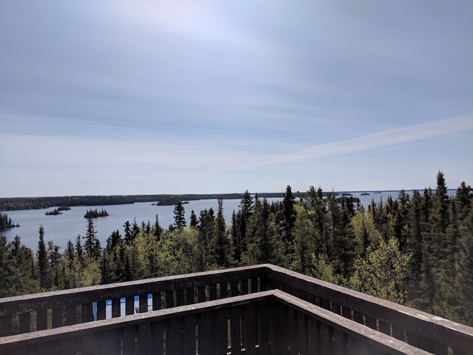 A distinctive Viewing Tower offers 360-degree panoramic views of the lake, forest, and rock formations, complete with interpretive displays about the region's fur trade heritage.