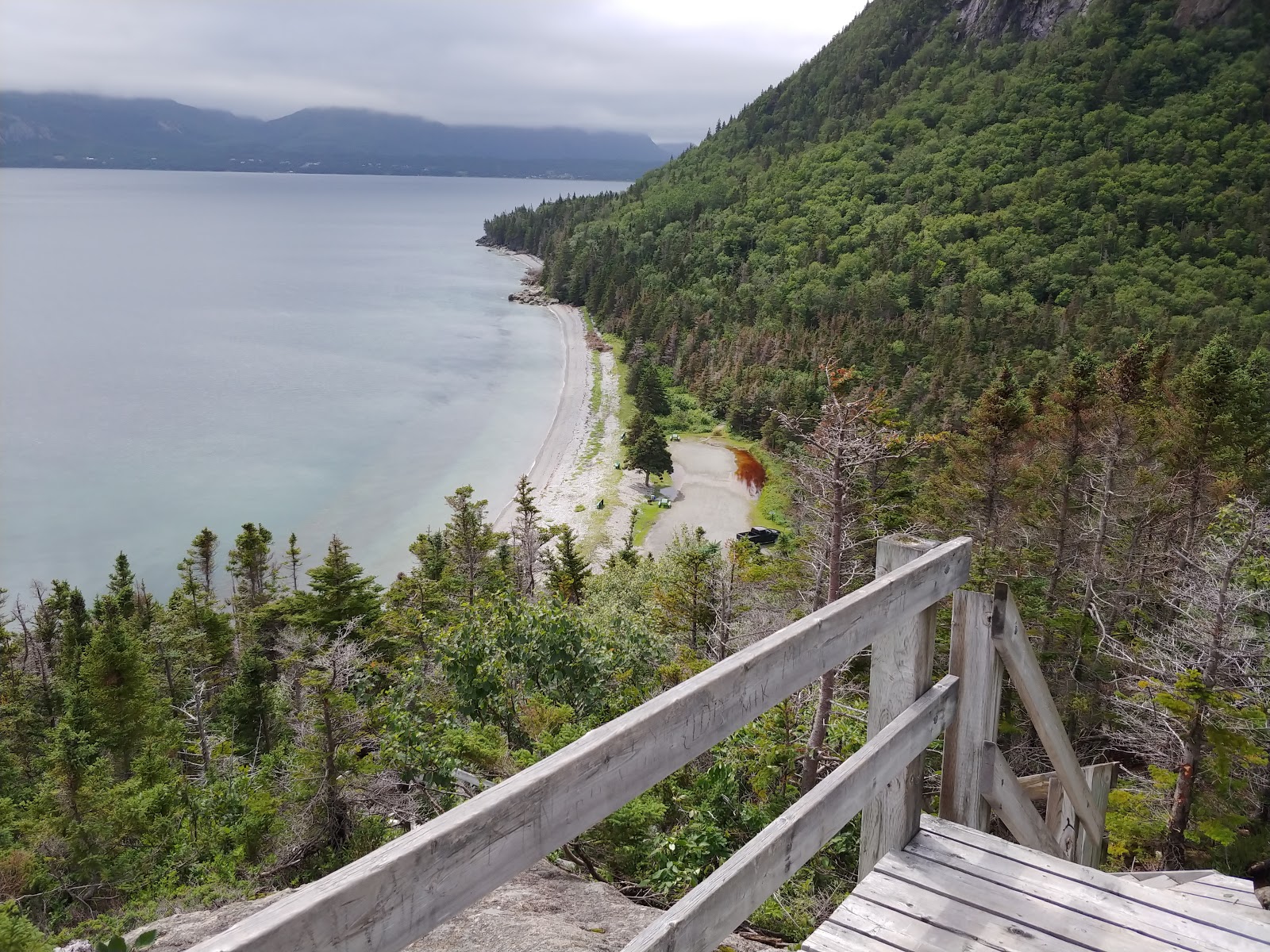 Blow Me Down Provincial Park is a stunning coastal retreat on the west coast of Newfoundland, nestled on a peninsula beneath the Blow Me Down Mountains along the Bay of Islands, approximately 60 km west of Corner Brook via Highway 450. Surrounded by Balsam Fir forests and dramatic volcanic landscapes, the park sits within the Serpentine Range subregion and offers sweeping views of island-dotted coastal waters. The campground features 28 forested campsites equipped with picnic tables and fire grills, alongside a comfort station with flush toilets and showers, coin-operated laundry facilities, a trailer dump station, water hookups throughout, and a playground. Hikers can explore the iconic Governor's Staircase, a trail descending through 450-million-year-old volcanic rock to a scenic cobble beach, as well as the Lark Harbour Head Trail and Look-out Trail. The park is well-suited for kayaking, bird watching, beach exploration, bicycling, stargazing, and wildlife observation. Annual Canada Day celebrations add a festive community atmosphere. Whether seeking dramatic coastal scenery, geological wonders, or a peaceful forested campsite in Newfoundland and Labrador, Blow Me Down Provincial Park delivers an exceptional outdoor experience on Canada's Atlantic coast.