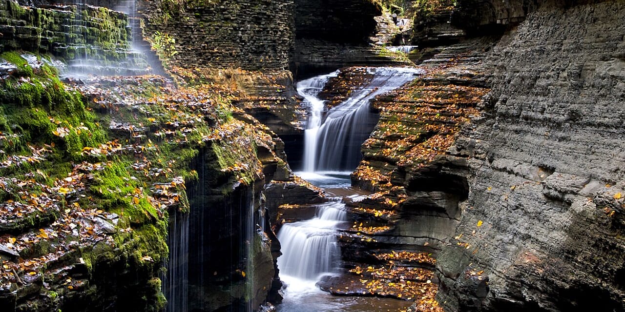 The Gorge Trail is the park's signature hike, a roughly 1.5-mile one-way route that climbs through the gorge past 19 waterfalls via stone staircases, tunnels, and bridges. The trail is typically open from mid to late spring through fall and can be combined with the Indian Trail for a loop. Trailhead parking at the Main Entrance accommodates passenger vehicles and some RVs, with additional parking at the South and Upper entrances. parks.ny.gov/parks/watkinsglen